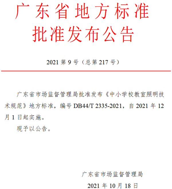 《中小學(xué)校教室照明技術(shù)規(guī)范》該標(biāo)準(zhǔn)于2021年12月1日起正式實(shí)施。發(fā)布會(huì)還透露:2023年廣東省將全面完成中小學(xué)校教室照明達(dá)標(biāo)任務(wù)。