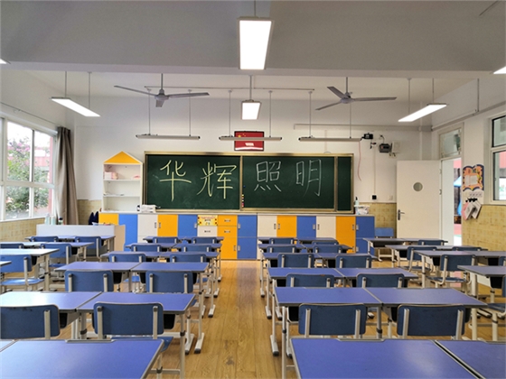 華輝教育照明設計了專門用于教室照明燈具——led護眼教室燈和led護眼黑板燈,符合國家標準課桌維持平均(恒)照度大于300lx,照度均勻度0.7;黑板維持平均(恒)照度500lx,照度均勻度0.8;顯色指數大于90,色彩還原性高;采用格柵防眩光設計,眩光值小于16,不刺眼;色溫是5000K,舒適柔和;整個教室照度均勻,無頻閃,沒有藍光危害。